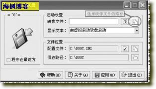 它是个绿色软件,解压后运行vFloppy.exe即打开程序,主界面如图1所示。单击“选择映像文件的路径”按钮,然后选择BOOTDISK.img或NTFS.img,单击[应用]按钮即完成了Windows 2000(Windows XP或Windows 2003)+DOS双系统。