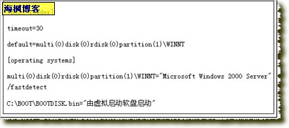 至于卸载虚拟启动软盘(其实谈不上卸载,因为本身并没有进行安装),只需将系统分区根目录下的Boot.ini文件打开(如图2所示),将启动菜单中的相应的启动项(比如:C:\BOOT\BOOTDISK.bin="由虚拟启动软盘启动" )删掉,或者将“timeout=30”改为 “timeout=0”就行了。